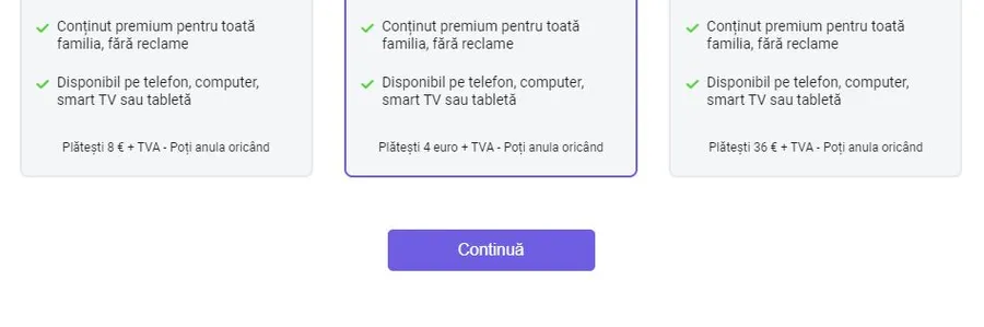 Vei fi redirecționat pe o nouă pagină unde poți afla ce pachete sunt disponibile și cât te costă un abonament la Voyo. În acest moment ai la dispoziție trei opțiuni: Abonament pe 3 luni, abonamentul lunar, sau cel anual. Dacă te interesează doar să vezi meciul Sparta Praga – FCSB, poți opta pentru opțiunea Abonament lunar, al cărui cost este de 4 euro+TVA, aproximativ 25 Ron. După ce ai selectat opțiunea dorită, apasă butonul Continuă.