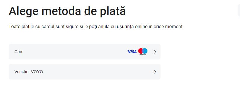 Dacă nu ai un voucher special, atunci poți plăti doar cu cardul. Apasă pe opțiunea Card și vei fi redirecționat pe pagina de unde se face plata.