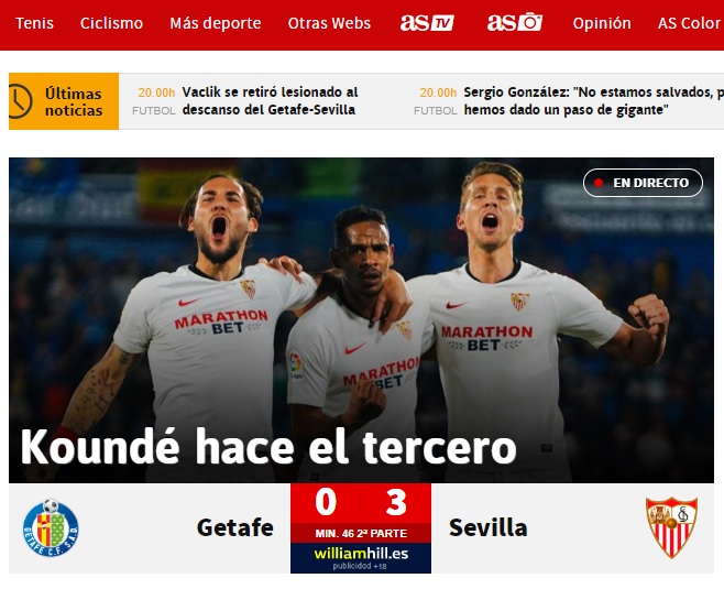 Sevilla a câștigat pe arena de la periferia Madridului cu 3-0. Ocampos a deschis scorul în minutul 43 cu o reluare simplă din fața porții. Fernando a majorat diferența în minutul 67, cu o deviere cu capul. Reușita a fost validată în urma consultării VAR.