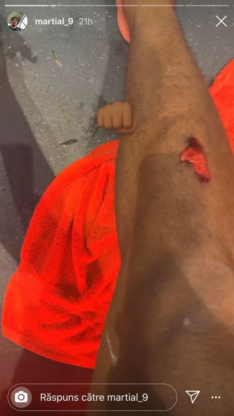 Anthony Martial (24 de ani) a ieșit accidentat în partida cu Manchester City, după o tăietură cruntă suferită la nivelul tibiei, în urma unei coliziuni cu portarul Ederson, care l-a proiectat în panourile publicitare.