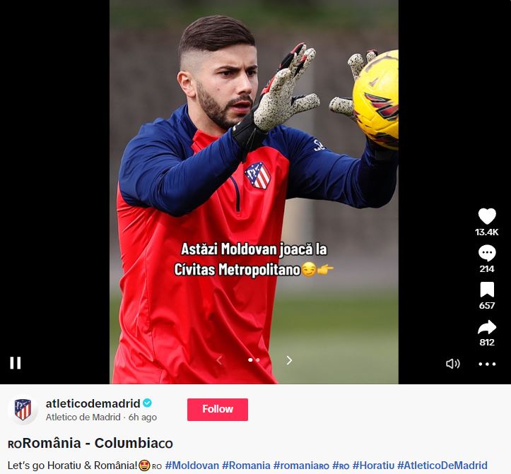 Clubul spaniol Atletico Madrid a postat un mesaj, în limba română, pe contul oficial de TikTok, care i se adresează românului Horațiu Moldovan.