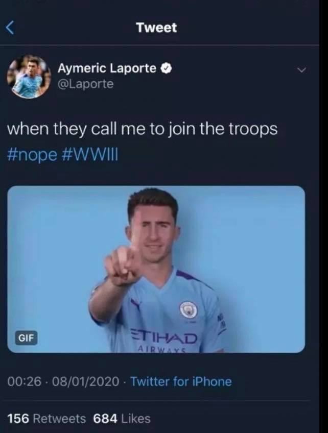 Acasa » Fotbal Extern » Aymeric Laporte, glumă nesărată pe Twitter despre conflictul dintre SUA și Iran. Jucătorul lui Manchester City a șters imediat postarea | FOTO