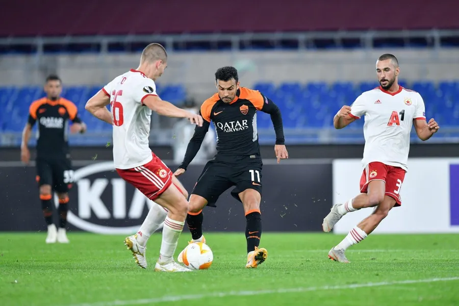 Valentin Antov, în duel cu Pedro, în timpul meciului AS Roma – ȚSKA Sofia