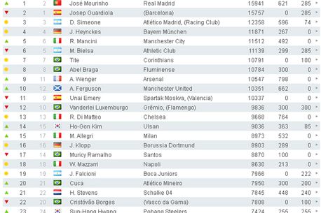 Cel mai bun tehnician din lume este în acest moment Jose Mourinho. Antrenorul lui Real Madrid a urcat pe prima poziție în top după meciul de aseară cu Barcelona, iar pe locul doi se află Pep Guardiola. Deși nu are echipă în acest moment, Guardiola se află peste antrenorii de la Atletico Madrid, Bayern Munchen sau Manchester City, tehnicieni care activează și continuă să strângă astfel puncte în acest top. Wenger și Ferguson sunt antrenorii care încheie top 10.