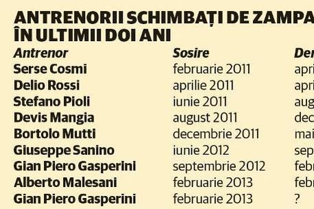 După 26 de etape din Serie A, Palermo ocupă ultimul loc, cu doar 20 de puncte, la șase puncte de locul 17, ocupat de Genoa, care asigură rămânerea în prima ligă. Un sezon surprinzător de slab pentru sicilieni, care au câștigat doar trei meciuri până acum. Iar patronul Maurizio Zamparini s-a săturat de scuze și de evoluțiile slabe ale echipei. Imediat după egalul de sâmbătă pe teren propriu cu Genoa (0-0), Zamparini l-a demis pe antrenorul Alberto Malesani, adus în locul lui Gian Piero Gasperini (foto), după eșecul cu Atalanta de acum trei săptămâni, scor 1-2.