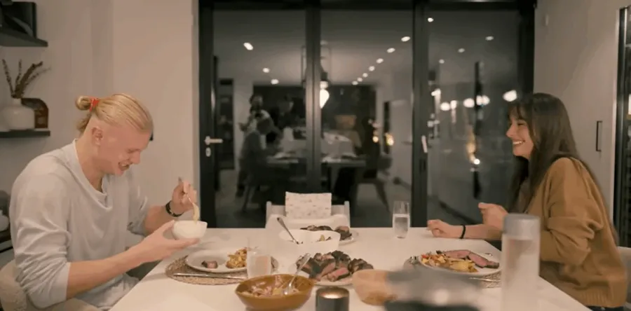 După ce se întoarce acasă de la antrenament, Haaland pregătește cina cu partenera sa de viață, iar fripturile mari tomahawk la grătar, asezonate cu cartofi și salată cu roșii și ceapă, sunt la ordinea zilei.