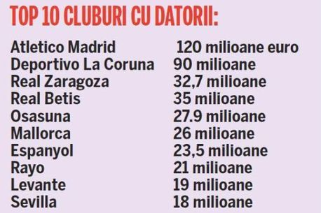 3,5 miliarde de euro este suma totală a datoriilor cluburilor din Spania către terți (doar 1.5% sunt restanțe salariale către jucători). Majoritatea datoriilor sunt la bănci și la stat