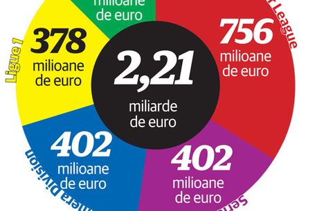 În acest context, nu e de mirare că sumele cheltuite de cluburile din Premier League, Bundesliga, Primera, Serie A și Ligue 1 s-au ridicat la amețitorul total de 2,21 miliarde de euro, conform firmei de audit „Deloitte”. Iar topul a fost condus de prima ligă engleză, cele 20 de cluburi din Albion cumpărând jucători de 756 de milioane de euro în ultimele trei luni, record absolut! Podiumul a fost completat de Primera, cu 402 milioane, dintre care 91 doar din transferul lui Bale, și de Serie A, tot cu 402 milioane cheltuite. Pe patru s-a clasat Ligue 1, cele 20 de cluburi din Hexagon cheltuind 378 de milioane pe transferuri, în timp ce Bundesliga a fost „codașa” Big 5, cu „doar” 276 milioane.