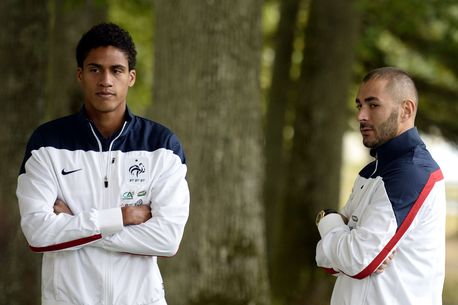 Raphael Varane (stânga) și Karim Benzema. Colegi la Real Madrid, cei doi sunt considerați indispensabili în selecționata lui Deschamps. FOTO: AFP