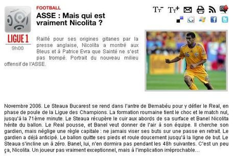 Bănel Nicoliță este deja vedetă la Saint Etienne. Francezii nu uită de tontogolul de pe Bernabeu, dar spun că Nicoliță nu poate fi altceva decât o afacere excelentă pentru fosta campioană din Hexagon: „E un țigan care luptă să fie respectat! Cu el pe teren, colegul de pe extremă poate dormi liniștit”
