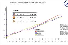 Niciodată în istoria Primera Division nu a existat o luptă atât de pasionantă pentru titlul de campioană. Cu două etape rămase de disputat înaintea finalului de sezon, trei echipe speră în continuare la titlu. Pentru a face totul și mai interesant, două dintre ele, Atletico Madrid și Real Madrid, sunt calificate și în finala Ligii Campionilor. Iar ca un ultim condiment, toate cele trei echipe nu au reușit să câștige în ultima etapă în fața unor adversari modești. Momentan, cu șase puncte rămase în joc, Atletico este pe primul loc, cu 88 de puncte, urmată de Barcelona, care are 85 de puncte, și Real Madrid, aflată la patru puncte de lider. Care este însă programul etapelor rămase și cum pot câștiga cele trei formații titlul?