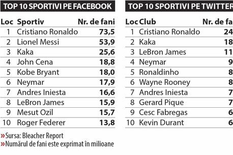 Câștigătorul ultimului Balon de Aur, Cristiano Ronaldo, este, de departe, cel mai popular sportiv al planetei, dacă luăm în considerare datele de analiză pentru social media. Conform socialbakers.com, CR7 are doar pe Facebook 73,5 milioane de fani, mai mult decât FC Barcelona sau Real Madrid, ultima fiind și echipa la care acesta evoluează. Popularitatea lui Ronaldo este la fel de mare și pe Twitter, acolo unde contul său oficial este urmărit de 24,5 milioane de oameni din întreaga lume. Și pe această platformă de social media vedeta lui Real Madrid este lider detașat. Într-un top zece al celor mai populari sportivi din lume pe Twitter, imediat lângă Ronaldo apare, oarecum surprinzător, Ricardo Kaka, acum la AC Milan. Brazilianul de 31 de ani, fost câștigător al Balonului de Aur, este urmărit de 18 milioane de oameni. Din acest clasament lipsește însă un nume foarte important: Leo Messi. Cel mai important jucător al Barcelonei este foarte puțin activ pe acest site de socializare și, în consecință, nu are nici măcar un milion de „followers” pe contul oficial (981.000).