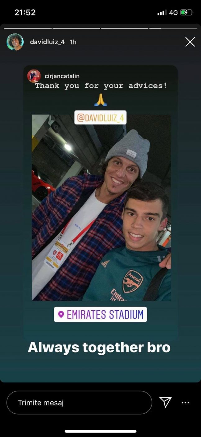 Fotbalistul român a postat pe contul personal de Instagram o imagine în care este împreună cu David Luiz, alături de mesajul „Îți mulțumesc pentru sfaturi”. Ulterior, David Luiz a răspuns: „Întotdeauna împreună, frate”.