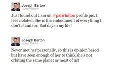 „Nu am cunoscut-o personal, dar din auzite cred că ea nu trăiește pe aceeași planeta ca mulți dintre noi”, a fost prima postare a fotbalistului, după care s-a enervat văzând că diva a pus coperta ca poză de profil pe contul ei de Twitter: „Abia am aflat că sunt pe poza de profil a lui Paris Hilton. Mă simt violat. Ea este întruchiparea a tot ceea ce detest. O zi proastă în viața mea”.