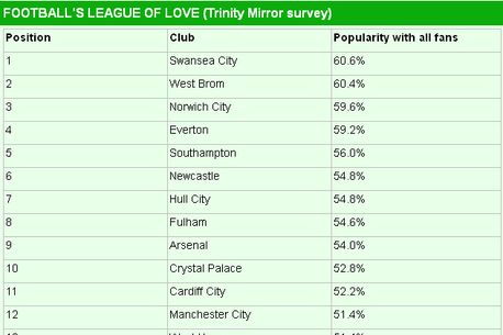 Mai mult de 6.000 de fani au luat parte la sondaj și au desemnat Swansea ca fiind cea mai plăcută echipă din prima divizie engleză. Pe următoarele locuri se află, în această ordine, WBA, Norwich și Everton. La polul opus, Chelsea a terminat în fața campionaei United în clasamentul celor mai urâte echipe ale Angliei.