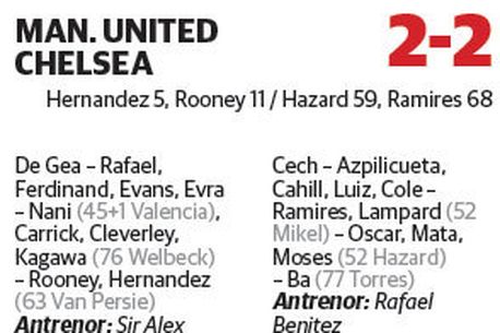 Până la introducerea lui Hazard din minutul 52, Chelsea nu a contat. Londonezii nu au avut nicio ocazie importantă, Mata, Moses și Oscar fiind blocați ușor de defensiva lui United. Însă cu o lovitură de geniu, șut cu efect din 16 metri, belgianul a redus din handicap (57). Iar peste alte 11 minute, Chelsea a egalat prin Ramires, omul odihnit la meciul cu Steaua finalizând un contraatac-școală al londonezilor. A fost un 2-2 care nu ajută niciuna dintre echipe, având în vedere că meciul se va rejuca pe „Stamford Bridge”, dar îi îngreunează calendarul lui Chelsea. Practic, după remiza de aseară, steliștii au învățat două lucruri: că defensiva lui Chelsea comite greșeli de care Tănase, Chipciu sau Rusescu pot să profite și că Chelsea nu e o formație care să renunțe nici măcar când e condusă cu 2-0, pentru că are jucători care pot întoarce facil soarta unei partide.