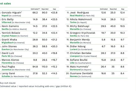 CIES Football Observatory a întocmit un top al celor mai supraevaluate transferuri, iar prima poziție este ocupată de trecerea lui Higuain de la Napoli la Juventus. „Bătrâna Doamnă” a achitat 90 milioane de euro în schimbul argentinianului. Eric Bailly venit de la Villarreal la Manchester United și Gameiro de la Sevilla la Atletico Madrid încheie top 3.