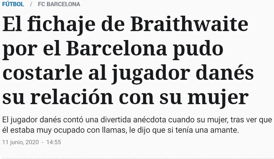 În luna februarie, Martin Braithwaite o lăsa pe modesta Leganes pentru a semna transferul vieții. Danezul a avut parte de adevărate clipe de coșmar în timpul negocierilor cu echipa lui Leo Messi. Atacantul nu i-a povestit soției despre pasul uriaș pe care avea să îl facă în carieră. Aceasta a crezut că este inșelată, iar cei doi au fost la un pas de divorț.