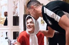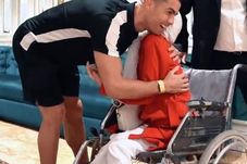 Aflată în scaun cu rotile, artista a fost îmbrățișată de către Cristiano Ronaldo în semn de mulțumire pentru darul primit, apoi starul portughez a și sărutat-o pe cap pe tânără.