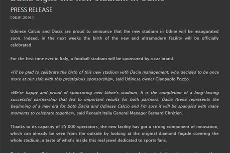 „Suntem mândri și fericiți că putem sponsoriza noul stadion al lui Udinese. Este o completare firească a parteneriatului pe care îl avem cu clubul. Dacia Arena reprezintă începutul unei noi ere în colaborarea pe care firma noastră o are cu Udinese și sunt convins că ne vom bucura împreună de multe succese și momente fericite”, a declarat Bernard Chrétie, manager general al Renault Italia.