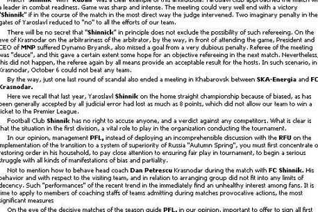 meciurilor”, scriu cei de la Shinnik într-un comunicat