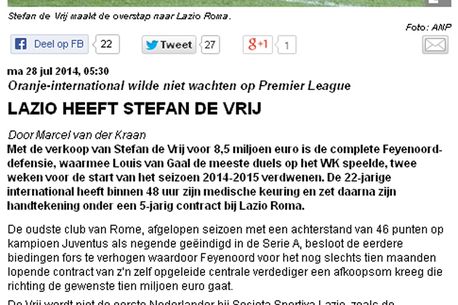 Cei de la De Telegraaf anunță că internaționalul lui Feyenoord va ajunge în Italia, la Lazio. Conform sursei citate, suma de transfer pe care o va încasa Feyenoord este de aproximativ 8,5 milioane de euro. Jucătorul în vârstă de 22 de ani va efectua vizita medicală în următoarele 48 de ore și va semna un contract pe cinci ani cu formația romană la care este legitimat și Ștefan Radu.