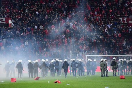 Suporterii lui Olympiakos s-au enervat teribil în momentul în care arbitrul italian a acordat lovitură de la 11 metri pentru AEK, în minutul 82, la scorul de 1-1. Încă de atunci au încercat să pătrundă pe teren. Au aruncat cu obiecte pe suprafața de joc, iar la golul al treilea al lui AEK suporterii lui Olympiakos nu au mai rezistat și au intrat pe teren.