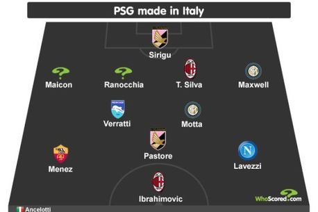 Sirigu (Palermo) – Silva (AC Milan), Maxwell (Inter Milano) – Verratti (Pescara), Motta (Inter Milano) – Pastore (Palermo), Menez (AS Roma), Lavezzi (Napoli) – Ibrahimovic (AC Milan) sunt jucătorii care au fost formați în Serie A sau Serie B și care au fost achiziționați de PSG.
