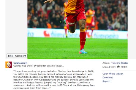 „M-ați numit maimuță, dar ați plâns când Chelsea a bătut Fenerbahce în 2008. M-ați numit maimuță, dar ați sărit în fața televizoarelor când am câștigat Liga Campionilor. M-ați numit maimuță, dar ați luat-o razna când am devenit campion cu Galataaray. Cel mai trist este însă că m-ați numit mai maimuță, dar ați uitat că ați sărit în sus când fratele meu „maimuță” (n.r. Pierre Webo) a înscris de două ori în derby… Vă numiți fani adevărați? Uitați-vă la comentariile suportrilor lui Galatasaray și învățați de la ei”, a scris Drogba pe pagina de facebook a lui Galatasaray.