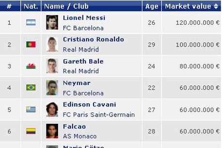 Messi și Ronaldo ocupă primele două poziții în clasamentul celor mai bine cotați jucători din lume. Podiumul este completat de Gareth Bale, cel mai scump transfer din vara trecută și, probabil, din istorie, conform unor informații apărute în presa din Spania, care susțin că s-au plătit în jur de 100 de milioane de euro pentru galez.
