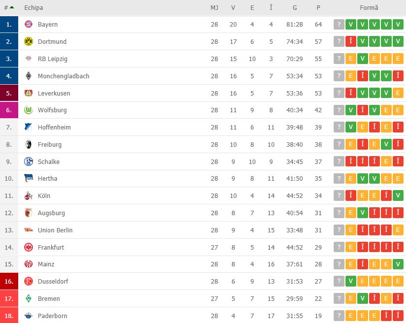 Cu șase etape înainte de finalul acestui sezon din Bundesliga, Bayern Munchen este lider, având un avans de șapte puncte față de Borussia Dortmund, echipa de pe locul secund, iar podiumul este completat de către Leipzig.