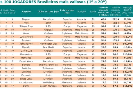 Neymar este urmat de Hulk, care este cotat la 46.2 milioane de euro, un plus de 17.% față de sezonul trecut. Podiumul este completat de Thiago Silva, cotat la 36.9 milioane de euro, în scădere cu 8.9% față de anul trecut.