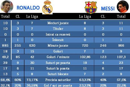 Chiar și cu debutul anunțat al lui Luis Suarez, capul de afiș al El Clasico de sâmbătă e ținut în continuare de duelul la distanță între Cristiano Ronaldo și Leo Messi. Jucătorii care se luptă pentru titlul de cel mai bun din lume au un sezon 2014-2015 excelent. Atât CR7, cât și Messi, au fost decisivi pentru echipele lor în campionat și în Liga Campionilor și, probabil, se vor întrece și pentru Balonul de Aur, care va fi decernat în ianuarie 2015. Pentru Messi ar fi a cincea distincție din carieră. Pentru Ronaldo, a treia. Însă cum arată statisicile din acest sezon?
