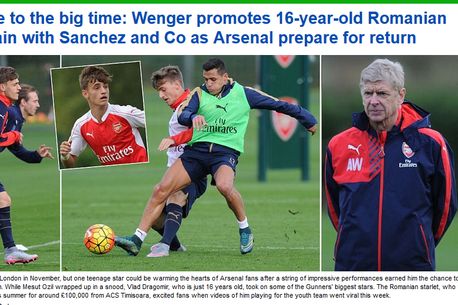 Iar evoluțiile bune nu au fost trecute cu vederea de Arsene Wenger, care a decis ca tânărul român să se antreneze alături de starurile tunarilor înainte de meciul cu WBA, din acest weekend. Iar Daily Mail notează Vlad Dragomir nu a arătat deloc trac în prezența unor vedete precum Olivier Giroud sau Alexis Sanchez, ba chiar a pus tare piciorul la minge, atunci într-un duel cu starul chilian, adus anul trecut de la Barcelona.