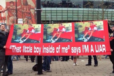 „‘That little boy inside of me” says I’M A LIAR'”, este mesajul pregătit de suporterii lui Arsenal cu referire la mesajul avut de Van Persie atunci când a fost prezentat la Manchester United: „Copilul din mine m-a împins la United”.