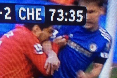 La scorul de 2-1 pentru oaspeți, Luis Suarez a încercat să îl muște de mână pe Branislav Ivanovic, gest care nu i-a atras însă eliminarea. E posibil ca brigada de arbitri, condusă de centralul Kevin Friend să nu fi văzut incidentul, dar uruguayanul nu va scăpa însă și de o suspendare din partea Comisiei de Disciplină, după ce se vor analiza imgainile video.