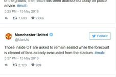 UPDATE 17:50 Au venit și primele reacții oficiale din partea clubului Manchester United, prin intermediul contului de Twitter. Formația de pe Old Trafford a confirmat descoperirea unui „pachet suspect” în zona de nord-vest a stadionulși a anunțat că anularea partidei a venit la recomandarea Poliției.