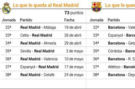 Ambele rivale mai au de disputat meciuri pe teren propriu cu ocupanta locului 4, Valencia. Real Madrid are deplasări problematice cu Celta Vigo (etapa 33) și Sevilla (etapa 35), dar dacă le va depăși cu bine poate spera la o minune și un veritabil cadou din partea rivalei Atletico Madrid.