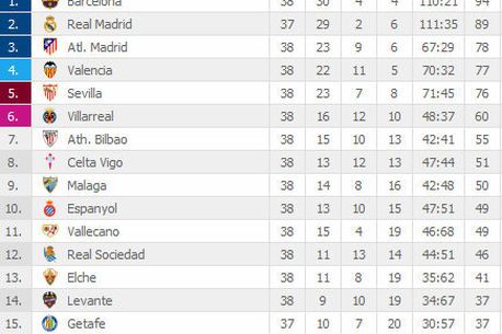 Pentru prima dată în istoria Spaniei, Primera este aproape de a trimite cinci echipe în Liga Campionilor, dintre care patru în grupe. FC Sevilla a ratat la mustață ultimul loc pentru Champions League, dar are șansa să ajungă în grupe dacă va câștiga finala Europa League.