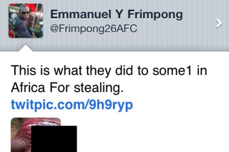Tânărul mijlocaș al lui Arsenal, ghanezul Emmanuel Frimpong a postat pe contul personal de Twitter o fotografie care a iscat numeroase controverse pe celebra rețea de socializare.