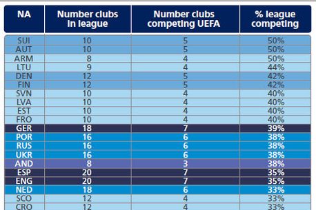 Dintre cele 18 echipe de la noi, doar 4 merg în cupele europene, adică 22%. Doar San Marino și Lichtenstein stau mai prost ca noi. Lidere la acest capitol sunt Elveția, Austria și Armenia, unde jumătate dintre echipele din campionatele lor joacă în cupele europene.