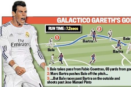 Galezul Gareth Bale a devenit eroul lui Real Madrid în finala Cupei Regelui, contra Barcelonei (2-1), după ce a reușit să marcheze pe final golul care a adus trofeul în vitrina „galacticilor”. Britanicul a punctat la capătul unei curse fenomenale, în care a părut să aibă cel puțin două viteze în plus față de urmăritorul său, Marc Bartra.