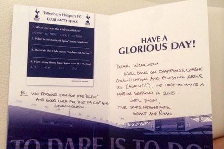 „Felicitări pentru ocuparea locului de Champions League și pentru faptul că ați terminat deasupra noastră sezonul (din nou!!!). Sper să avem mai mult noroc în 2015. Ai tăi vecini, fani ai lui Tottenham, Grant și Ryan. PS: te iertăm pentru selfie. Noroc mult în finala FA Cup și în lupta pentru Mănușa de Aur”, se arată în scrisoarea trimisă de cei doi suporteri ai lui Spurs.
