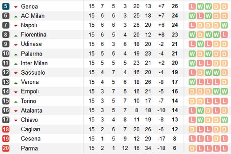 În clasament conduce Juventus Torino, cu 36 de puncte, urmată de AS Roma – 35 de puncte și de Lazio – 26 de puncte.
