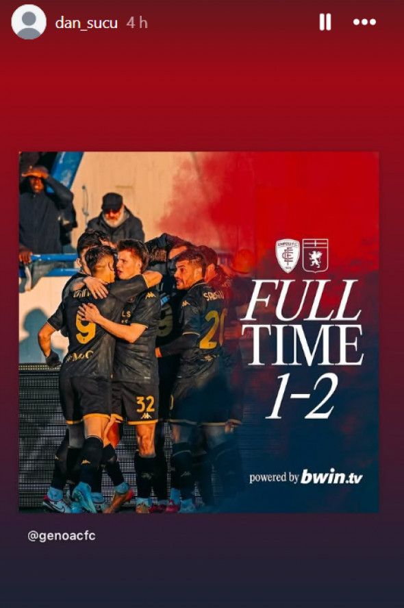 Dan Șucu a distribuit pe Instagram Story o fotografie postată de clubul Genoa, unde se prezenta scorul final. Omul de afaceri a părut mulțumit de jocul prestat și scorul obținut de formația lui Patrick Vieira.