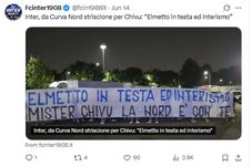 „Cu casca pe cap și dragoste pentru Inter/ Mister Chivu, Nordul este cu tine”, apare pe bannerul de susținere afișat de ultrașii lui Inter pentru antrenorul român.