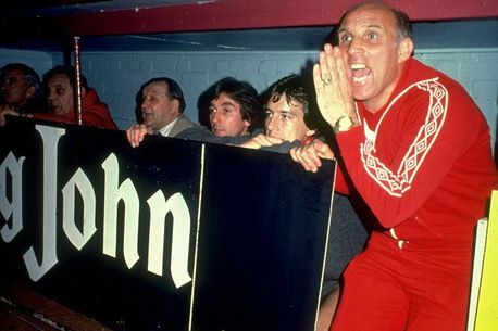 Ronnie Moran (în plan apropiat), în perioada în care era antrenorul lui Liverpool