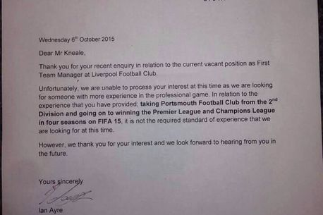 Din păcate, nu putem răspunde afirmativ solicitării dumneavoastră, pentru că noi căutăm pe cineva cu mai multă experiență în jocul de fotbal. Background-ul pe care dumneavoastră l-ați trecut – preluarea lui Portsmouth din Division 2 și câștigarea Premier League și Champions League în doar 4 sezoane la FIFA 2015 – nu este genul de experiență pe care să o căutăm pentru moment.