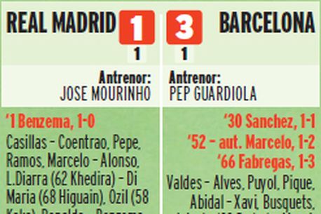 Lider în Primera, cu trei puncte peste Barça, 15 victorii consecutive în toate competițiile. Și impresia că poate, în sfârșit, să-și învingă marea rivală. O simplă fata Morgana pentru Real, până la urmă, iluzie întreținută și de debutul fulminant în al 164-lea derby din Primera. Golul lui Benzema a însemnat cea mai rapidă reușită din istoria „El Clasico” (secunda 22), dar n-a contat. Au cântărit mai mult alegerile făcute de cei doi antrenori în timpul partidei și forma jucătorilor, care au adus un nou succes al Barçei. A opta victorie în ultimele 12 derby-uri.