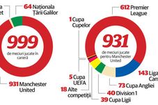 Ryan Giggs va intra azi, cu ocazia jocului cu Norwich, în clubul select al jucătorilor care au strâns cel puțin 1.000 de meciuri în carieră. Galezul a debutat la Manchester United exact acum 22 de ani